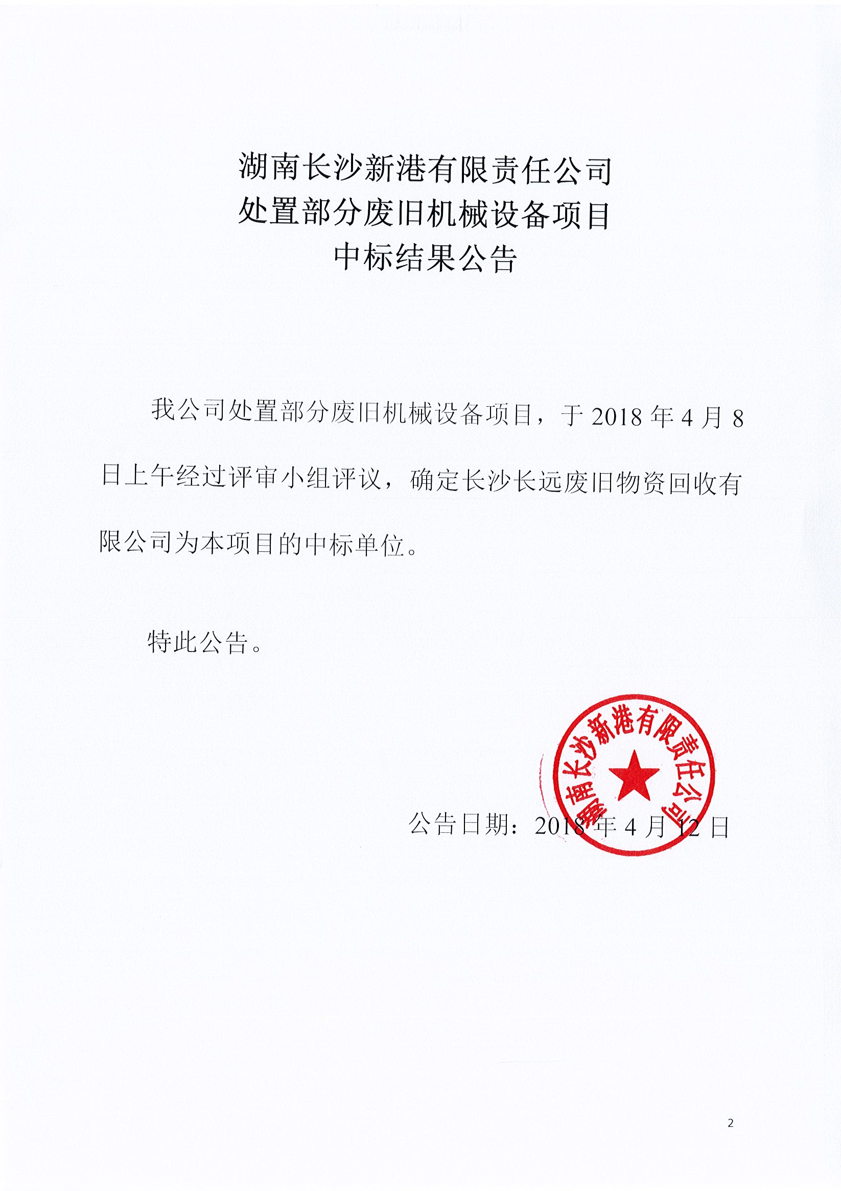 湖南長沙新港有限責(zé)任公司 處置部分廢舊機(jī)械設(shè)備項(xiàng)目中標(biāo)結(jié)果公告