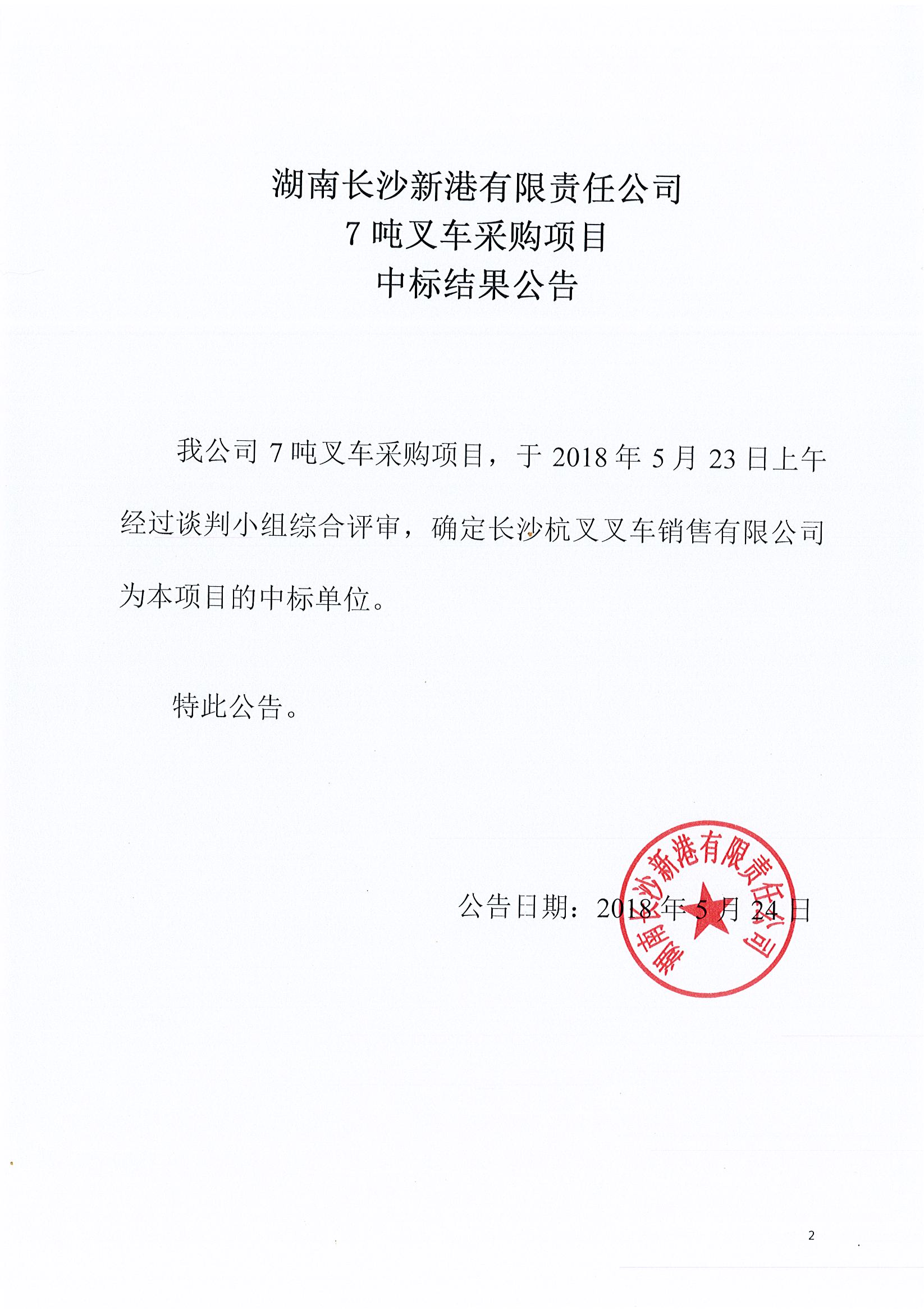 湖南長沙新港有限責(zé)任公司 7噸叉車采購項(xiàng)目中標(biāo)結(jié)果公告