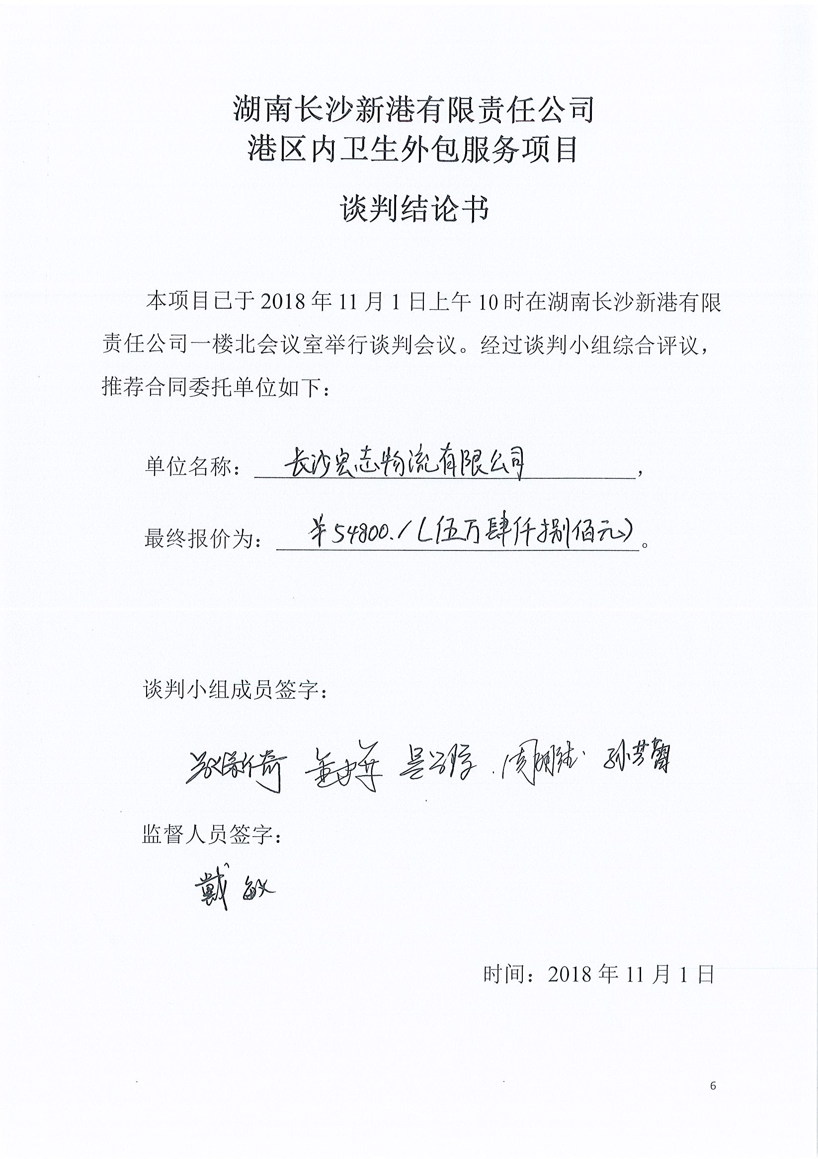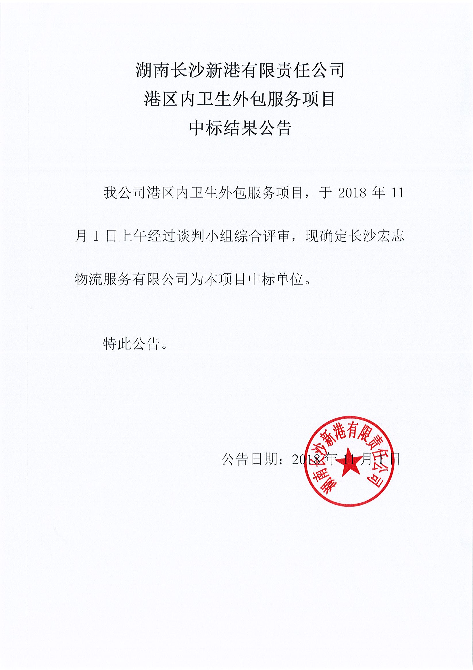 湖南長(zhǎng)沙新港有限責(zé)任公司港區(qū)內(nèi)衛(wèi)生外包服務(wù)項(xiàng)目中標(biāo)結(jié)果公示