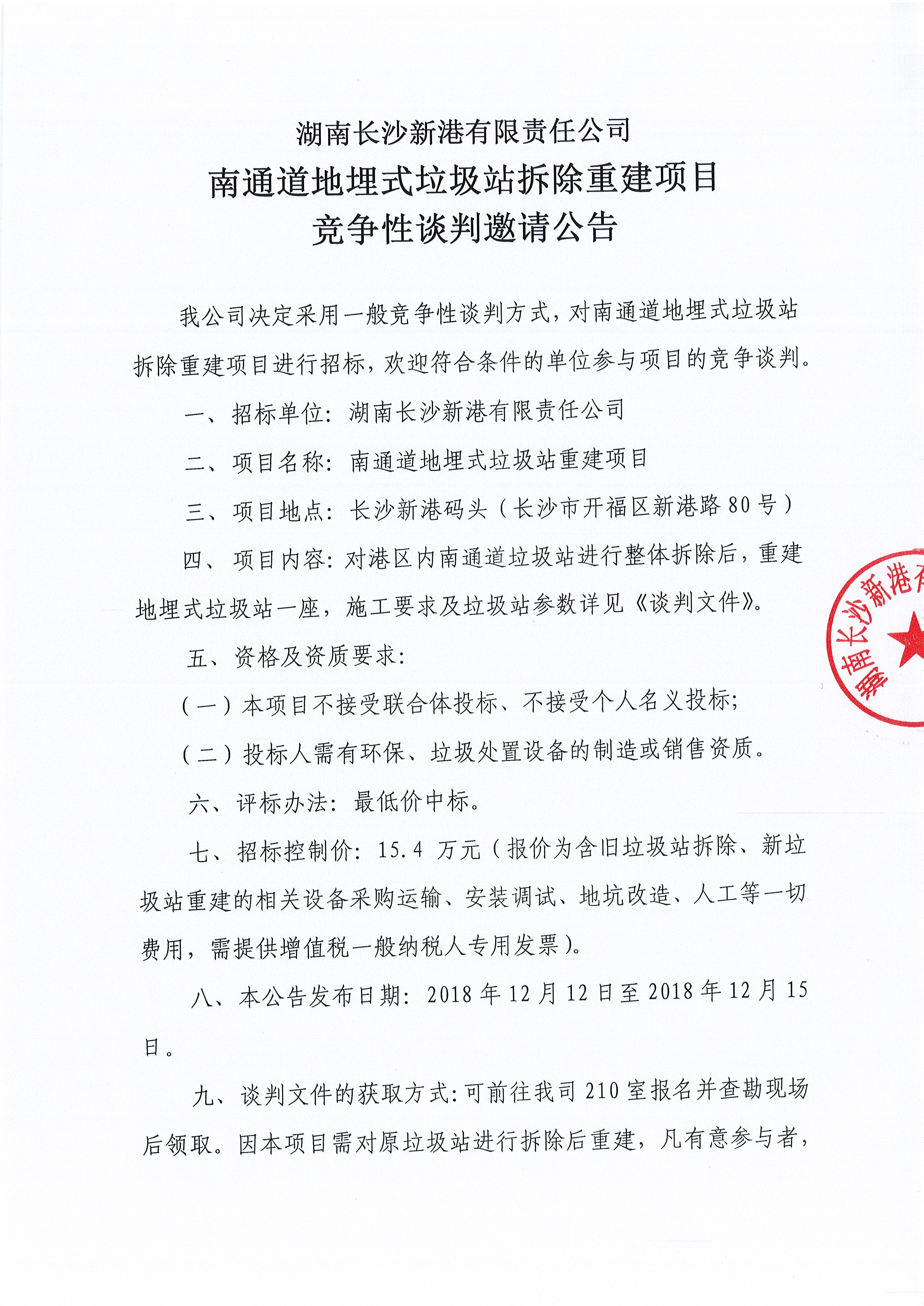 湖南長(zhǎng)沙新港有限責(zé)任公司南通道地埋式垃圾站拆除重建項(xiàng)目競(jìng)爭(zhēng)性談判邀請(qǐng)公告