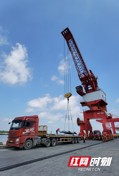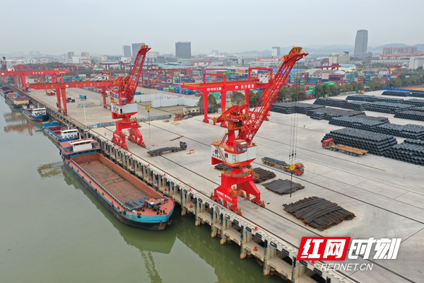 長沙新港南片區(qū)碼頭正在進(jìn)行鋼材裝卸作業(yè)。(洪琳 攝)