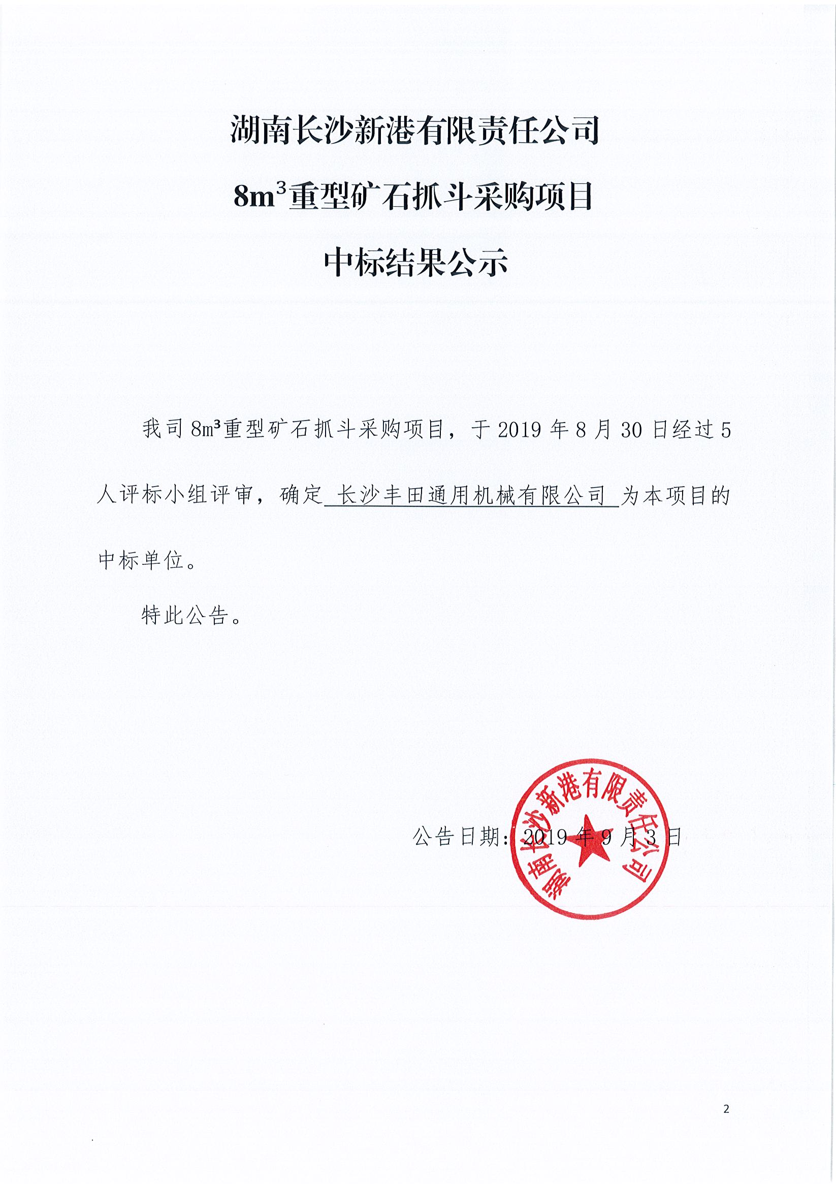 湖南長沙新港有限責(zé)任公司8m³重型礦石抓斗采購項目中標(biāo)結(jié)果公示