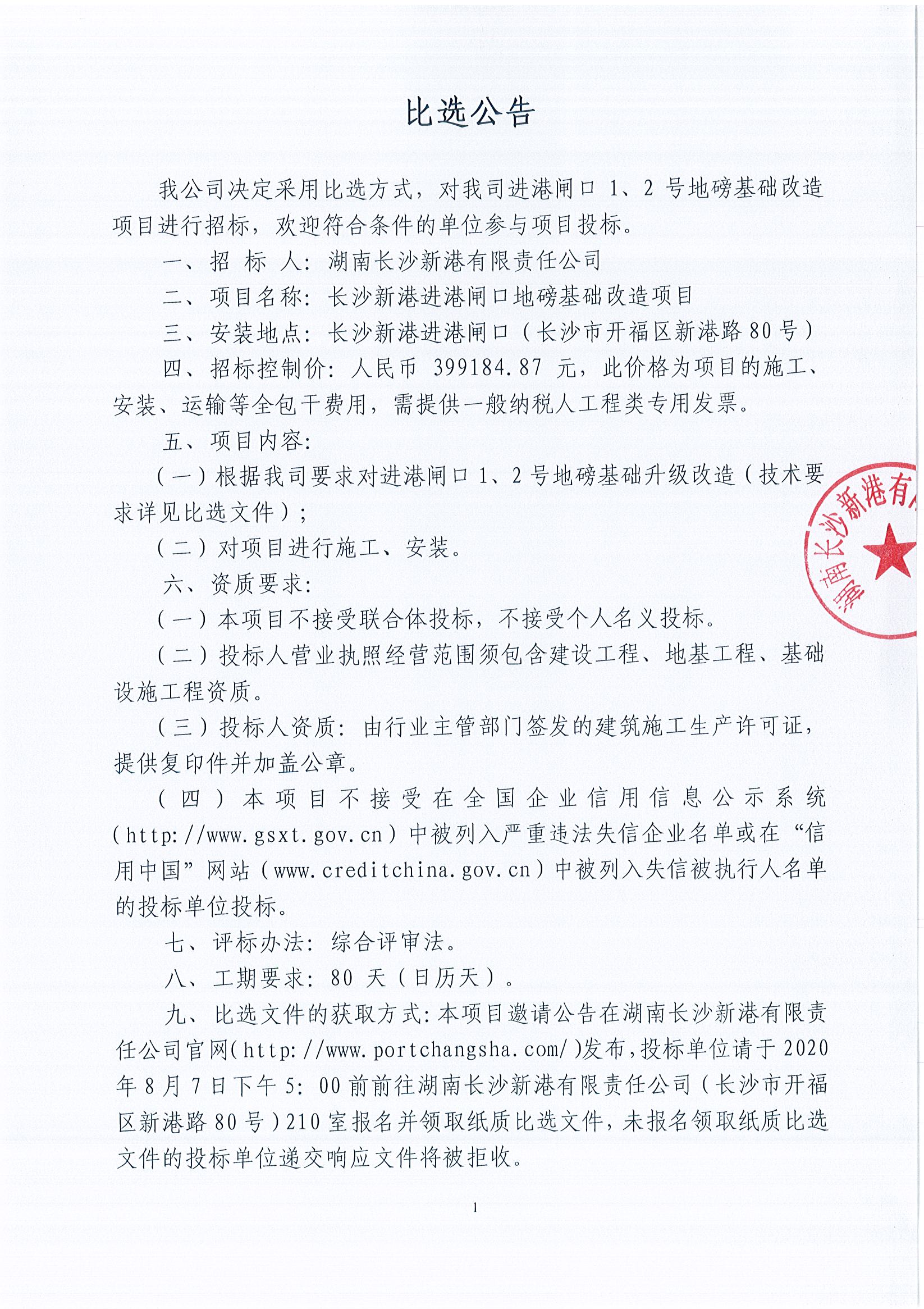 長沙新港進(jìn)港閘口地磅基礎(chǔ)改造項(xiàng)目比選公告