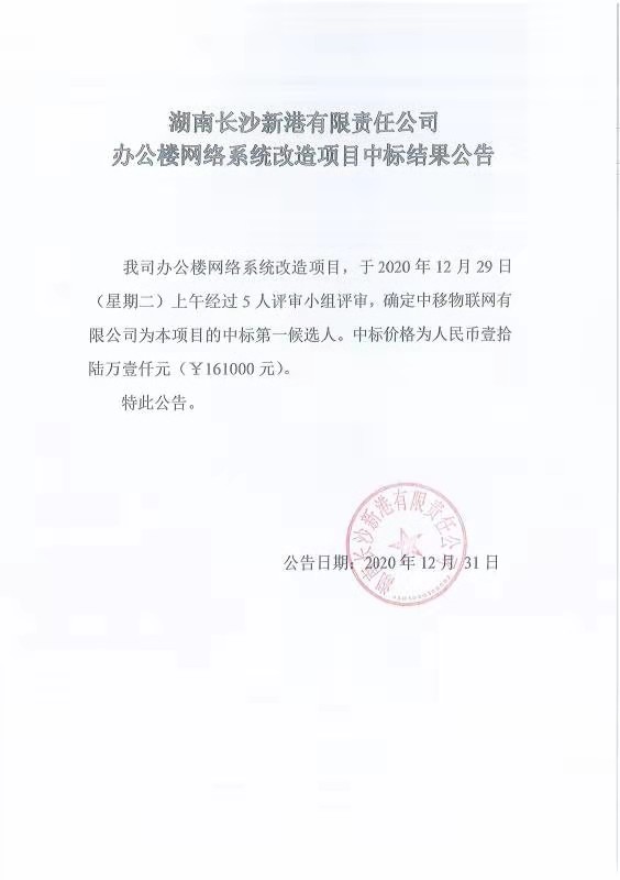 湖南長沙新港有限責任公司辦公樓網絡系統(tǒng)改造項目中標結果公告