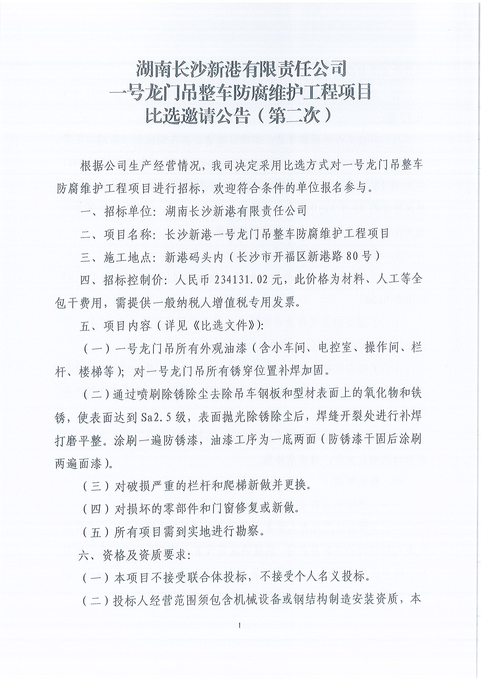 湖南長沙新港有限責(zé)任公司一號龍門吊整車防腐維護(hù)工程比選邀請公告(第二次)