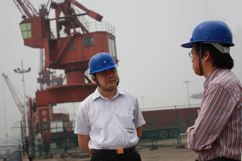 深圳市鹽田港集團有限公司副總經(jīng)理徐云國(左一)在碼頭上與長沙新港有限責任公司副總經(jīng)理張韜(左二)就港口發(fā)展進行交流。