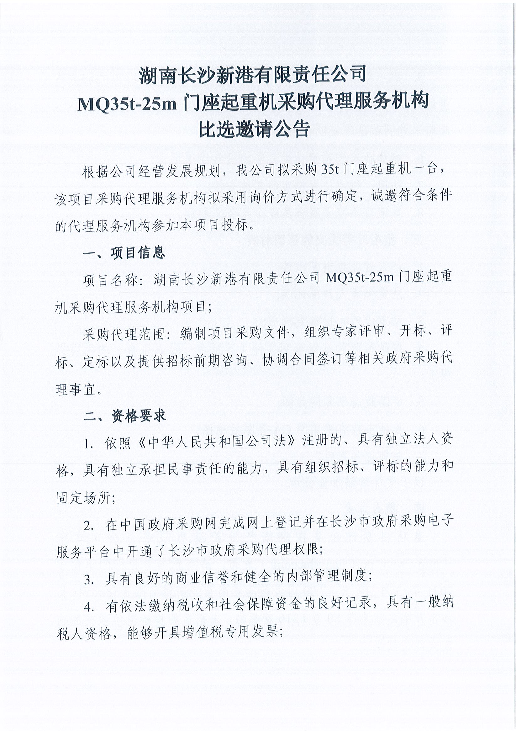 湖南長沙新港有限責(zé)任公司MQ35t—25m門座起重機(jī)采購代理服務(wù)機(jī)構(gòu)比選邀請(qǐng)公告