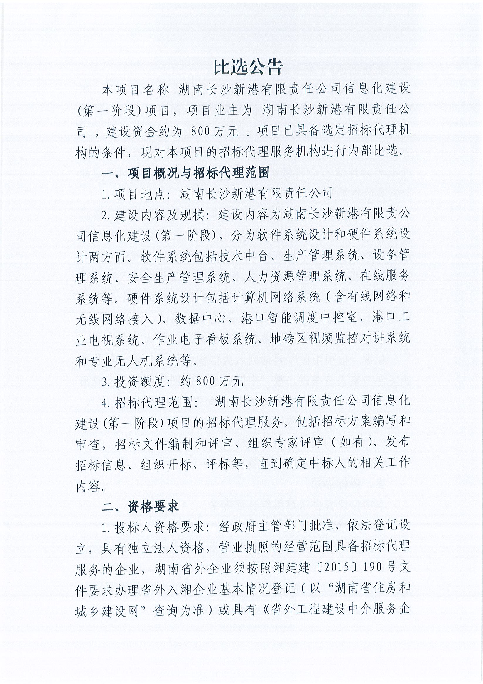 湖南長(zhǎng)沙新港有限責(zé)任公司信息化建設(shè)(第一階段)招標(biāo)代理服務(wù)機(jī)構(gòu)比選公告