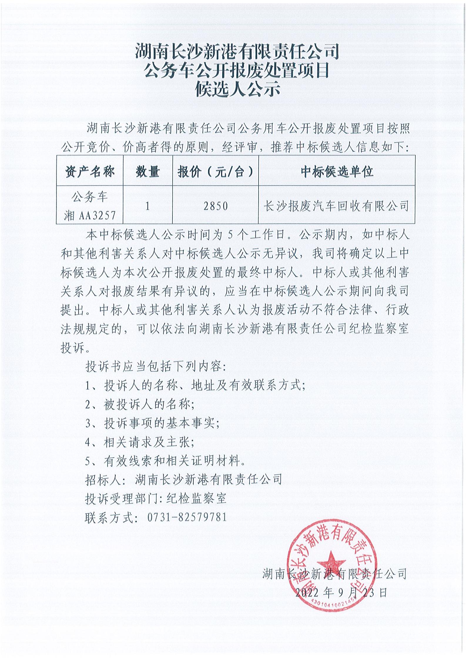 湖南長(zhǎng)沙新港有限責(zé)任公司公務(wù)車公開(kāi)報(bào)廢處置項(xiàng)目候選人公示