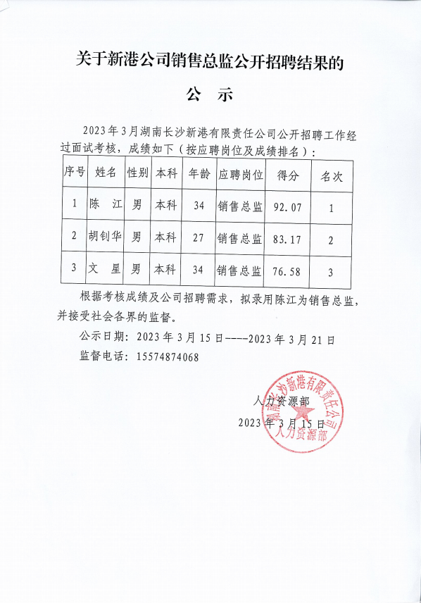新港公司銷售總監(jiān)公開招聘結果的公示