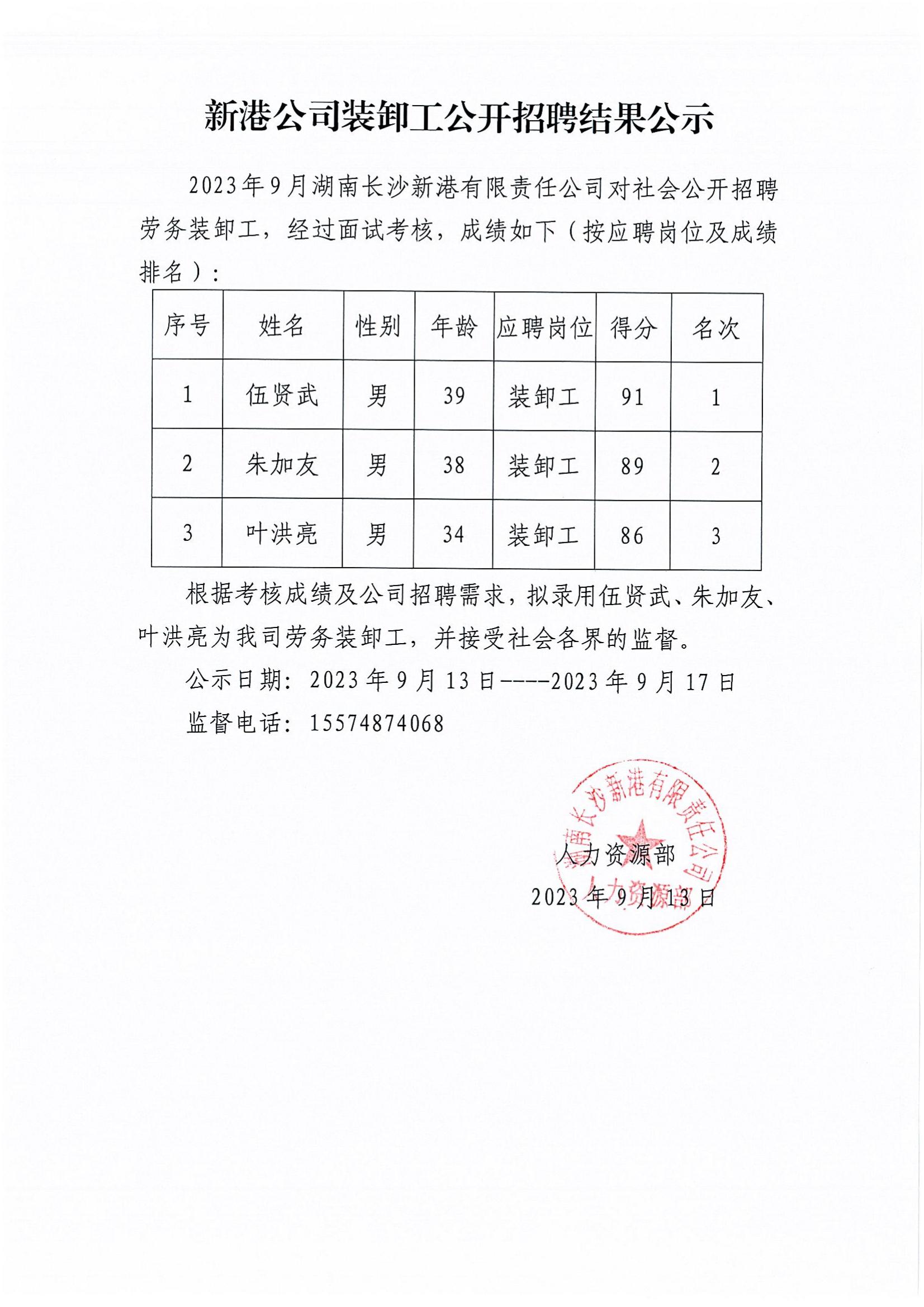 新港公司裝卸工公開招聘結(jié)果公示