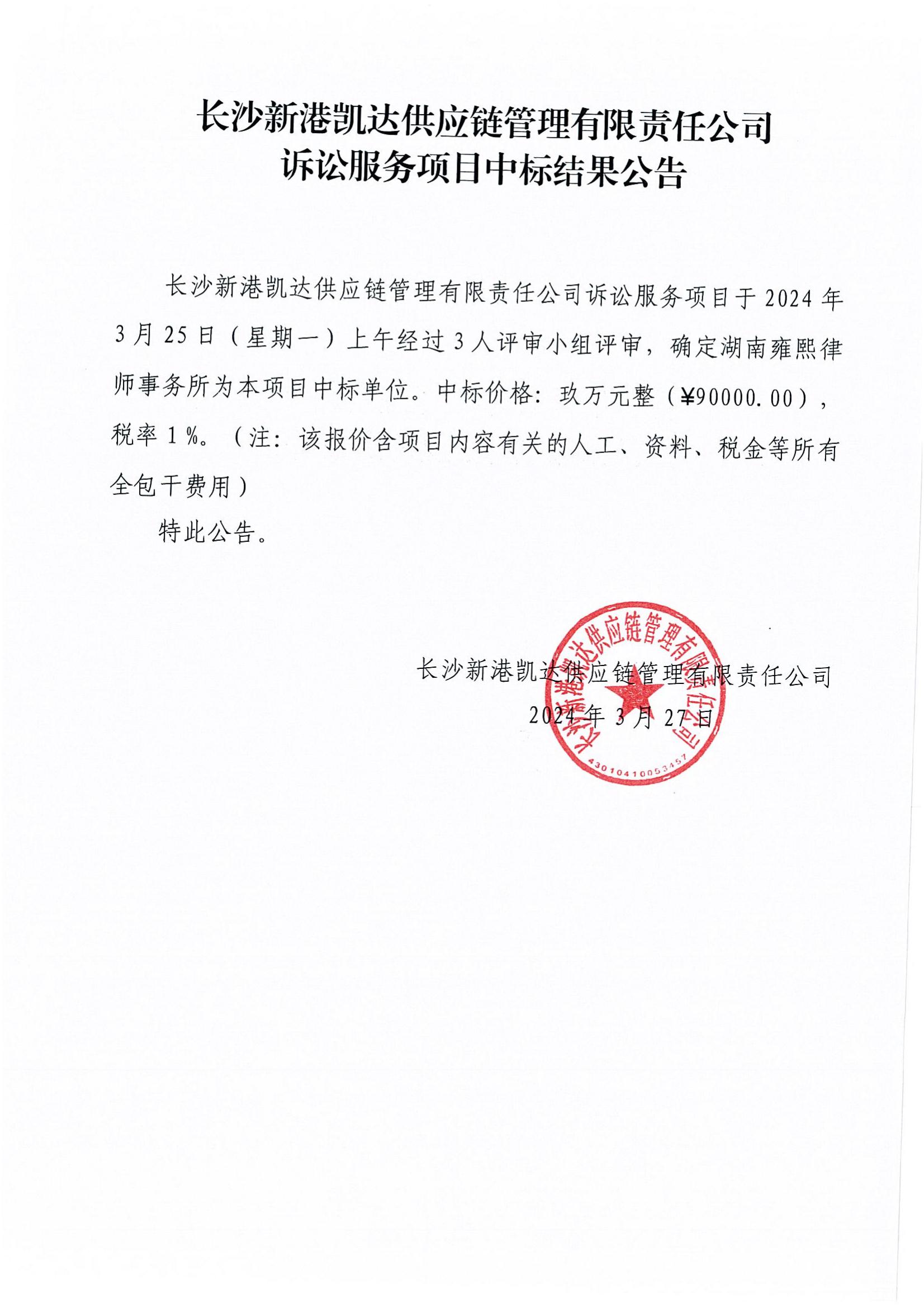 長沙新港凱達(dá)供應(yīng)鏈訴訟服務(wù)項(xiàng)目中標(biāo)結(jié)果公告