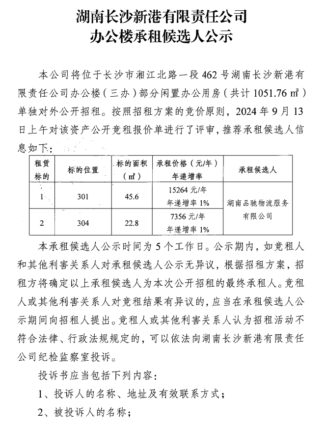 湖南長沙新港有限責任公司辦公樓承租候選人公示