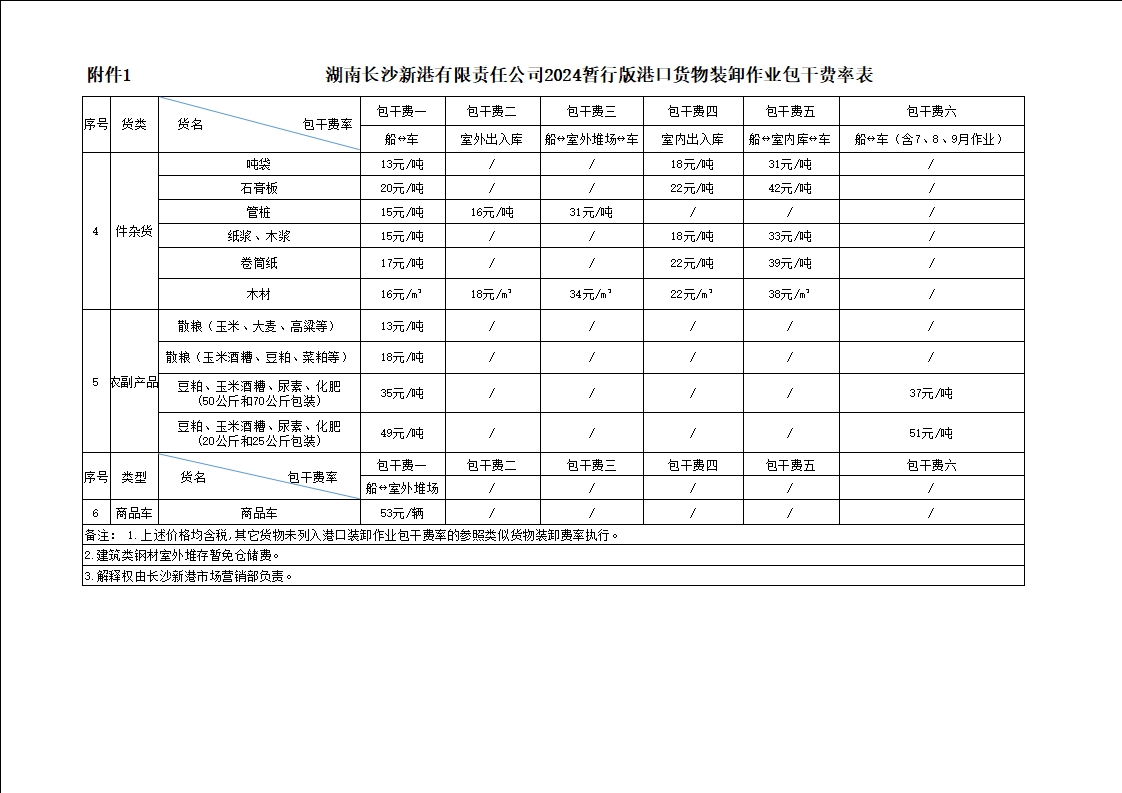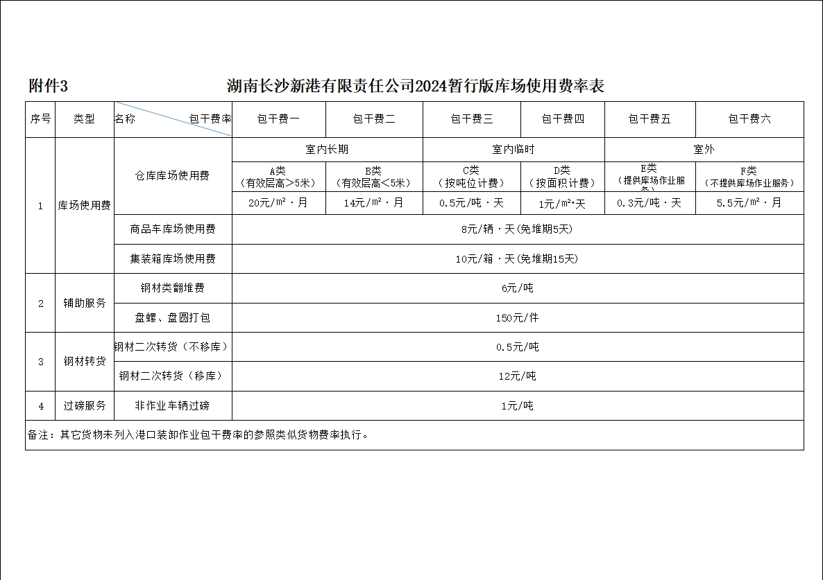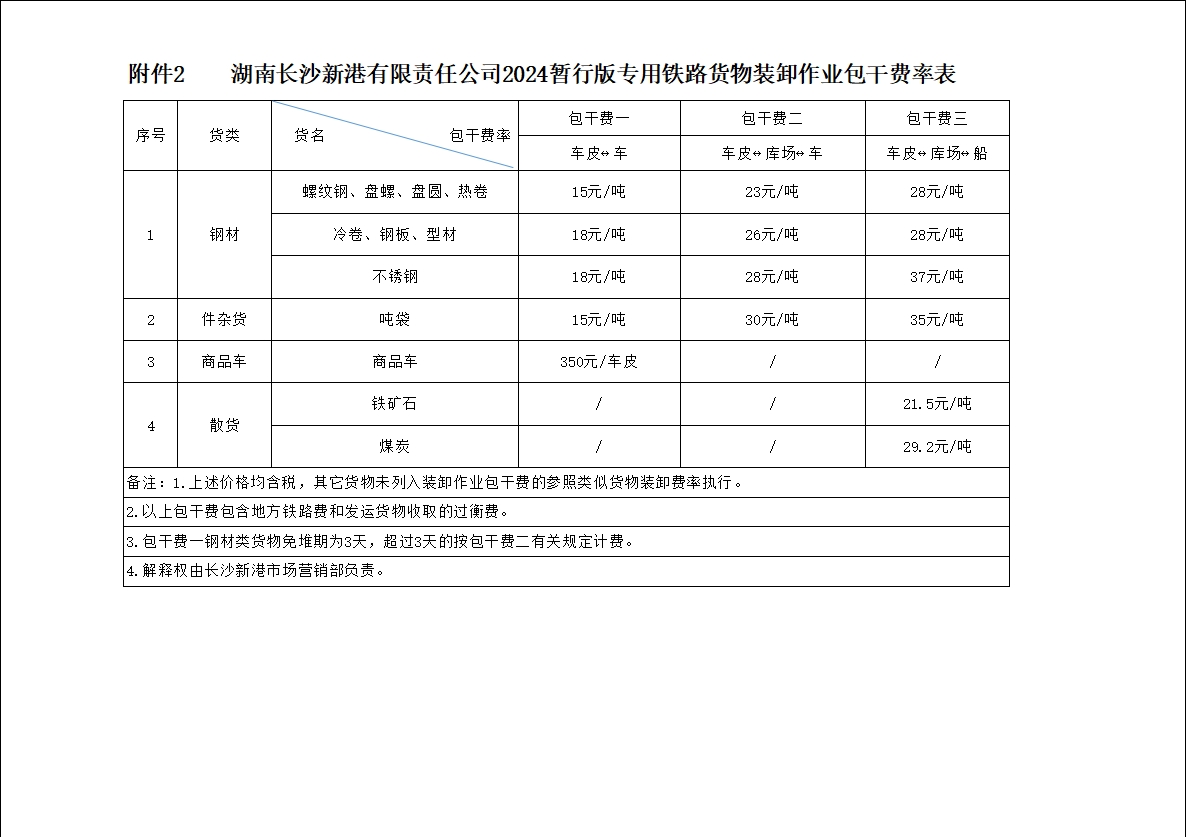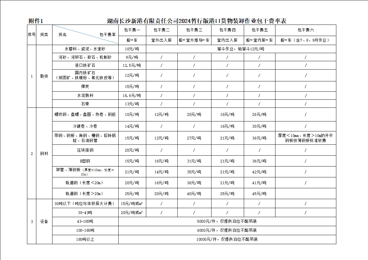 湖南長(zhǎng)沙新港有限責(zé)任公司2024暫行版港口貨物裝卸作業(yè)包干費(fèi)率、2024暫行版專用鐵路貨物裝卸作業(yè)包干費(fèi)率、2024暫行版庫(kù)場(chǎng)使用費(fèi)率及2024暫行版裝卸作業(yè)包干費(fèi)率階梯價(jià)格方案